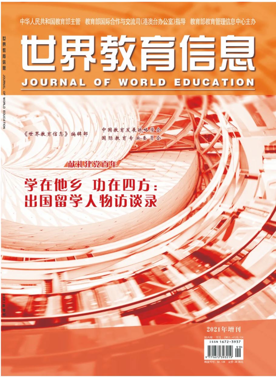 《世界教育信息》期刊是由教育部主管、教育部国际合作与交流司(港澳台办公室)指导、教育部教育管理信息中心主办。《世界教育信息》2021年增刊包含了此刊与中国教育发展战略学会国际教育专业委员会共同组稿、合作推出的“出国留学人物访谈录”,对来自各行业有代表性的留学归国人员进行访谈,内容涉及留学对个人学术和职业的影响、留学人员对我国重点行业领域发展的贡献、留学事业面临的问题及挑战等多个方面。