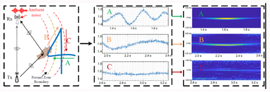 在手势识别等场景中,信号质量会随着设备摆放、手势位置、运动方向等不同而变化,因此将用户手势动作对应的信号质量当作恒定而统一进行预处理,就会造成手势识别的准确度不稳定。实际上当手处于不同位置和朝向时,有时信号变化远大于噪声,有时信号变化和噪声接近,所对应的感知信噪比和信号感知质量都是变化的。针对手部运动在不同位置和朝向下信号感知质量不一致问题,论文“Towards Robust Gesture Recognition by Characterizing the Sensing Quality of WiFi Signals”提出了一个信号感知质量度量模型。该模型通过刻画手部运动时有效感知信号和噪声信号的相对关系,可以实时量化WiFi-CSI 信号在不同时间不同位置的感知质量。基于无线信号的感知质量,论文进一步提出了一个基于感知质量指标的信号预处理框架。具体来说,该框架对于不同的感知质量的信号进行分类处理。对于感知质量较好的可以用于识别任务的信号,该框架利用多载波信息进一步提升信号质量;对于感知质量较差不能用于识别任务的信号,该框架通过先验知识推断此时手部运动信息。最终使得在不同位置不同朝向的手部运动均能提取准确的多普勒速度信息,可显著提高手势识别系统的性能和鲁棒性。该工作发表在CCF A类国际会议UbiComp 2022(ACM IMWUT)上,论文第一作者为博士生高睿扬。